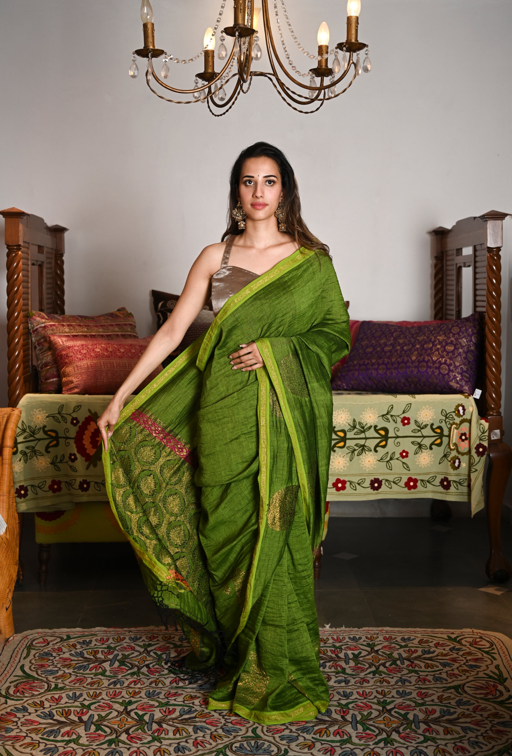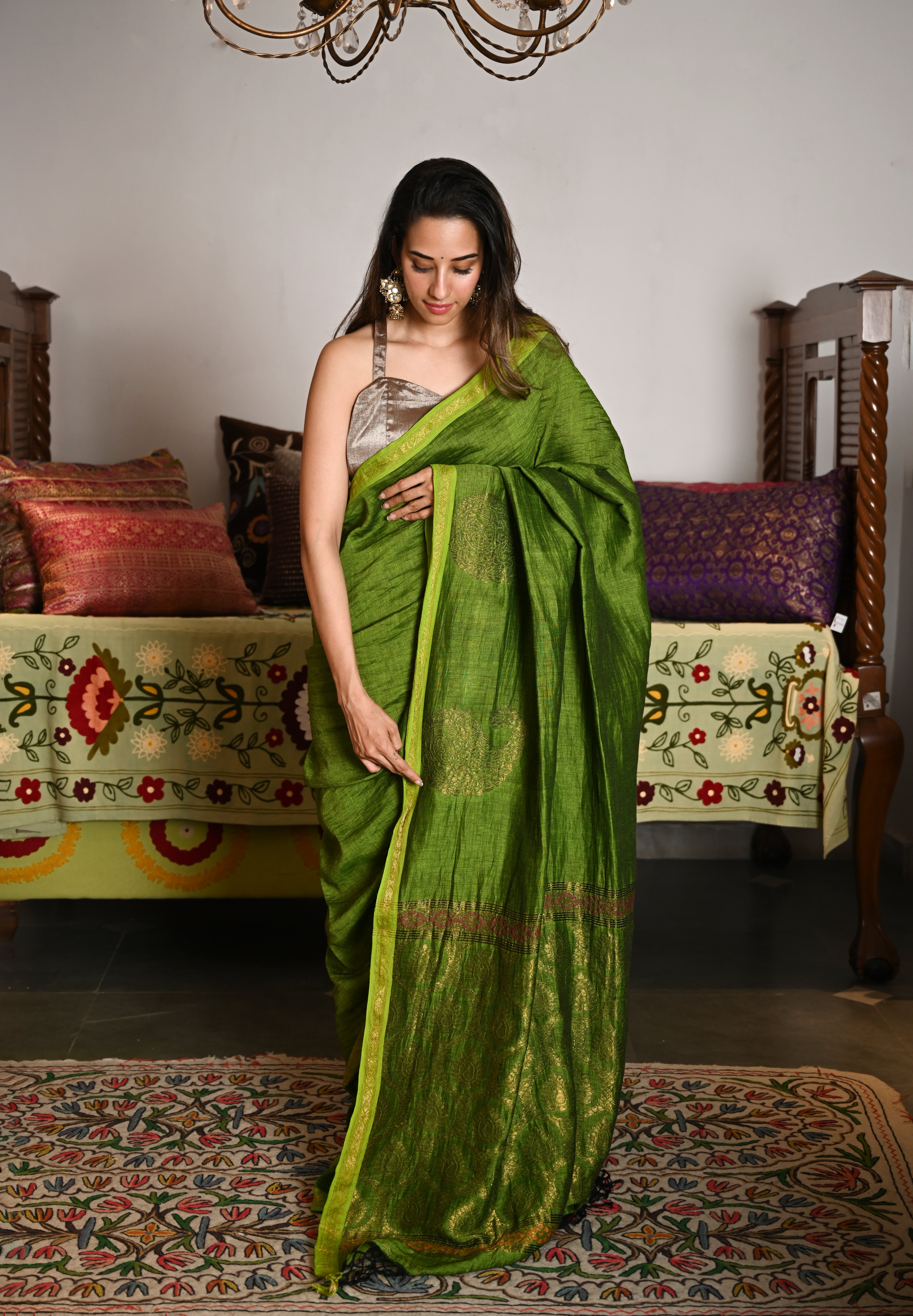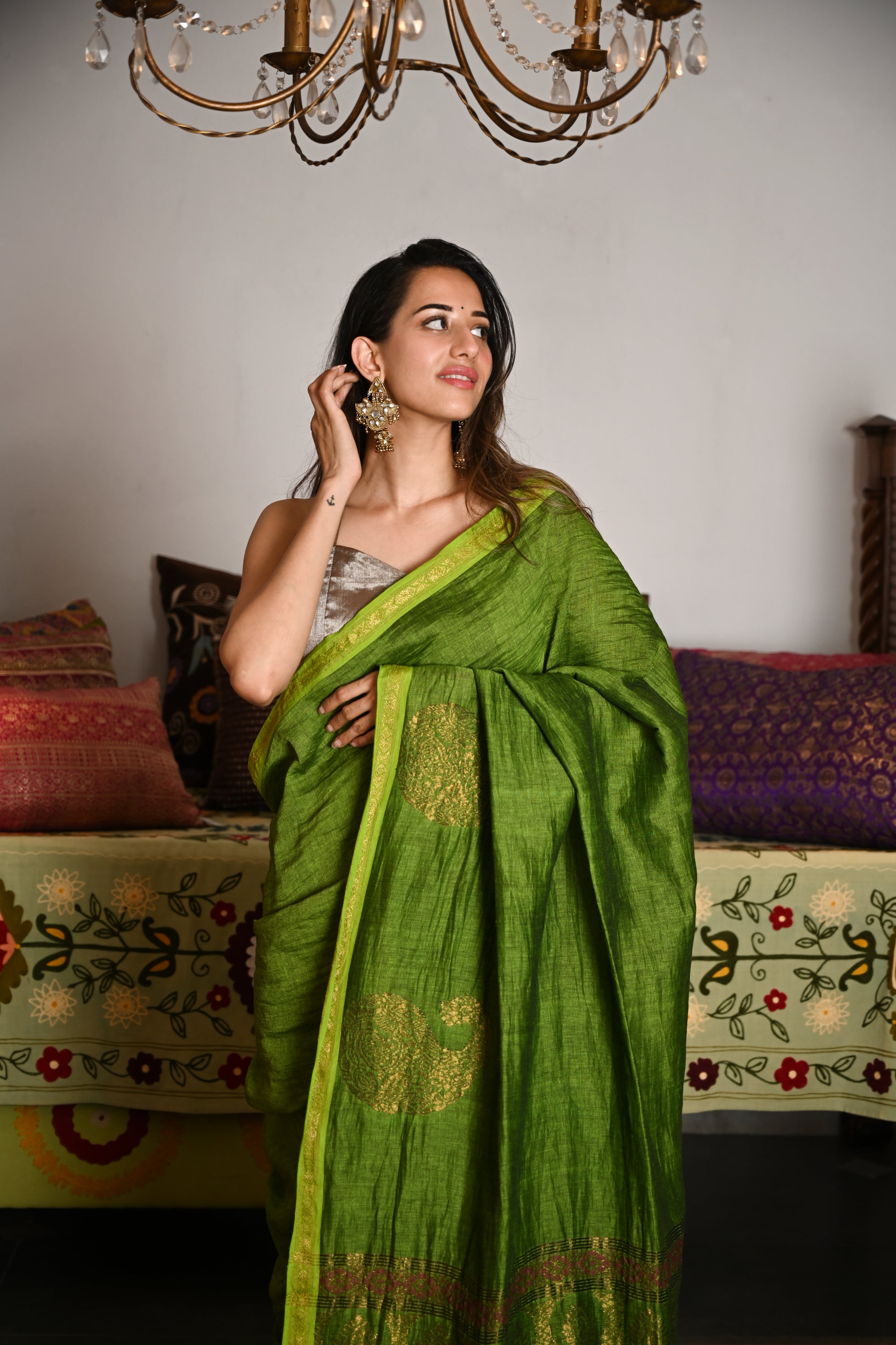 Keywords: green Jamdani saree, silk linen Zari saree, festive wear for women, luxury handloom saree.