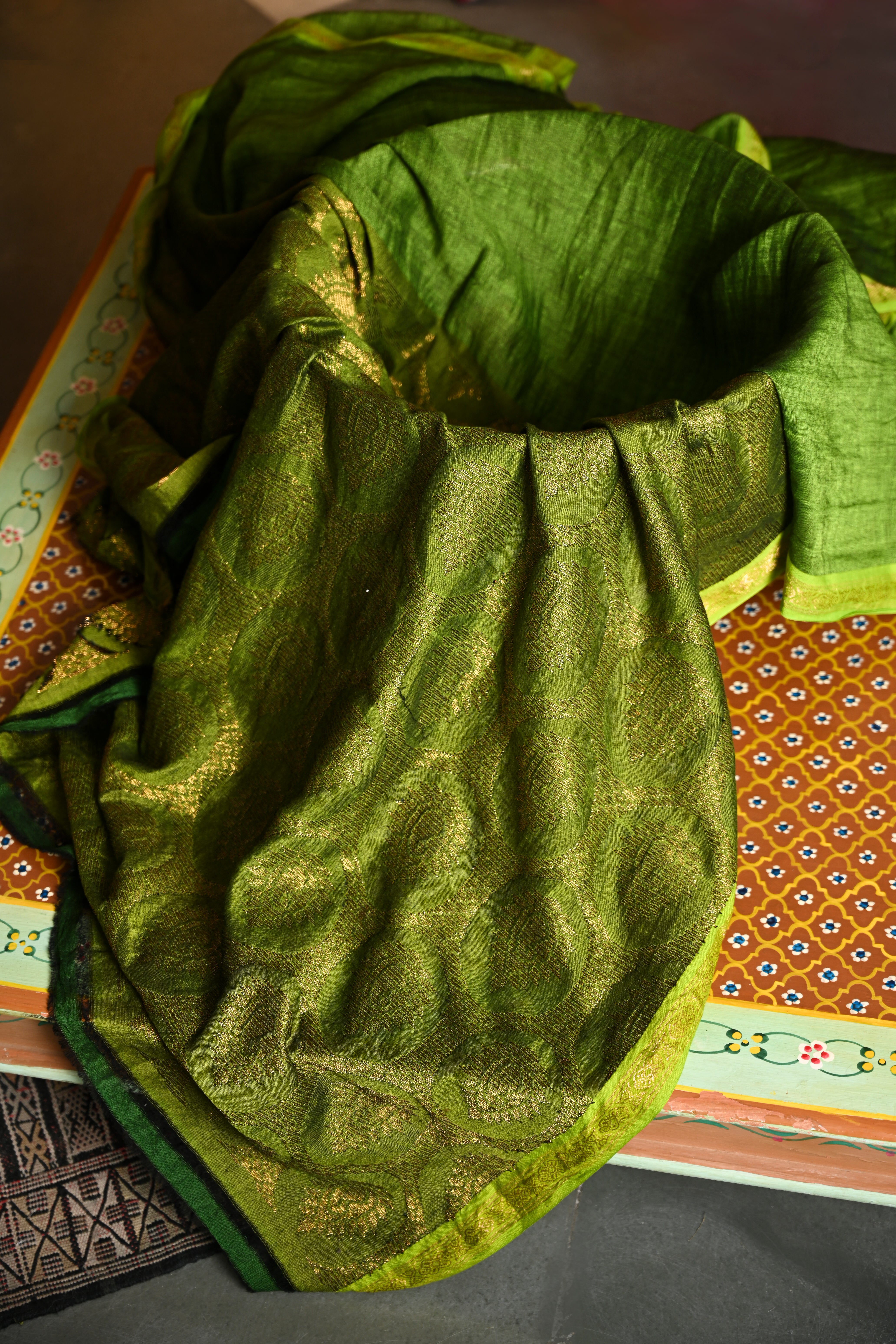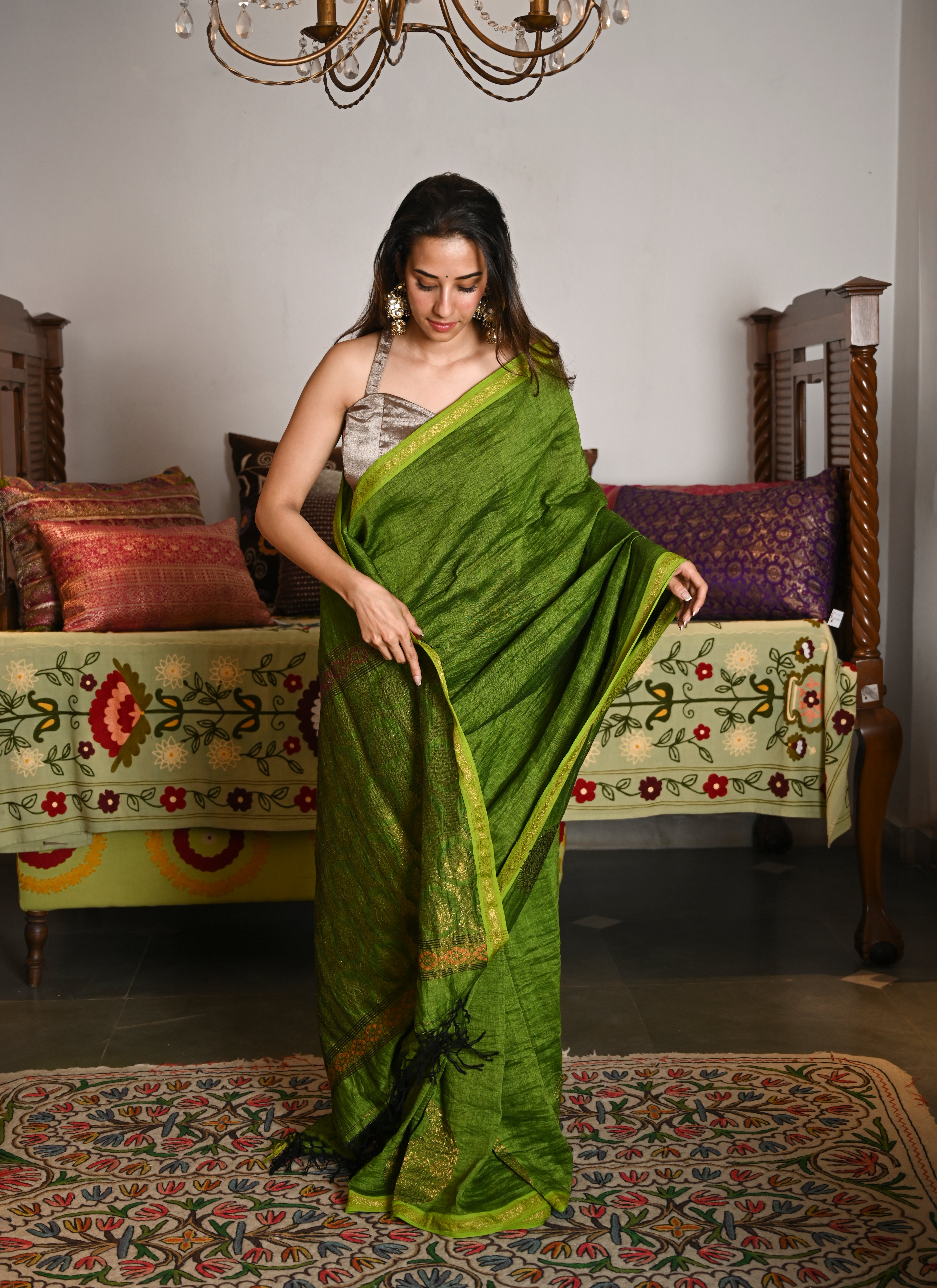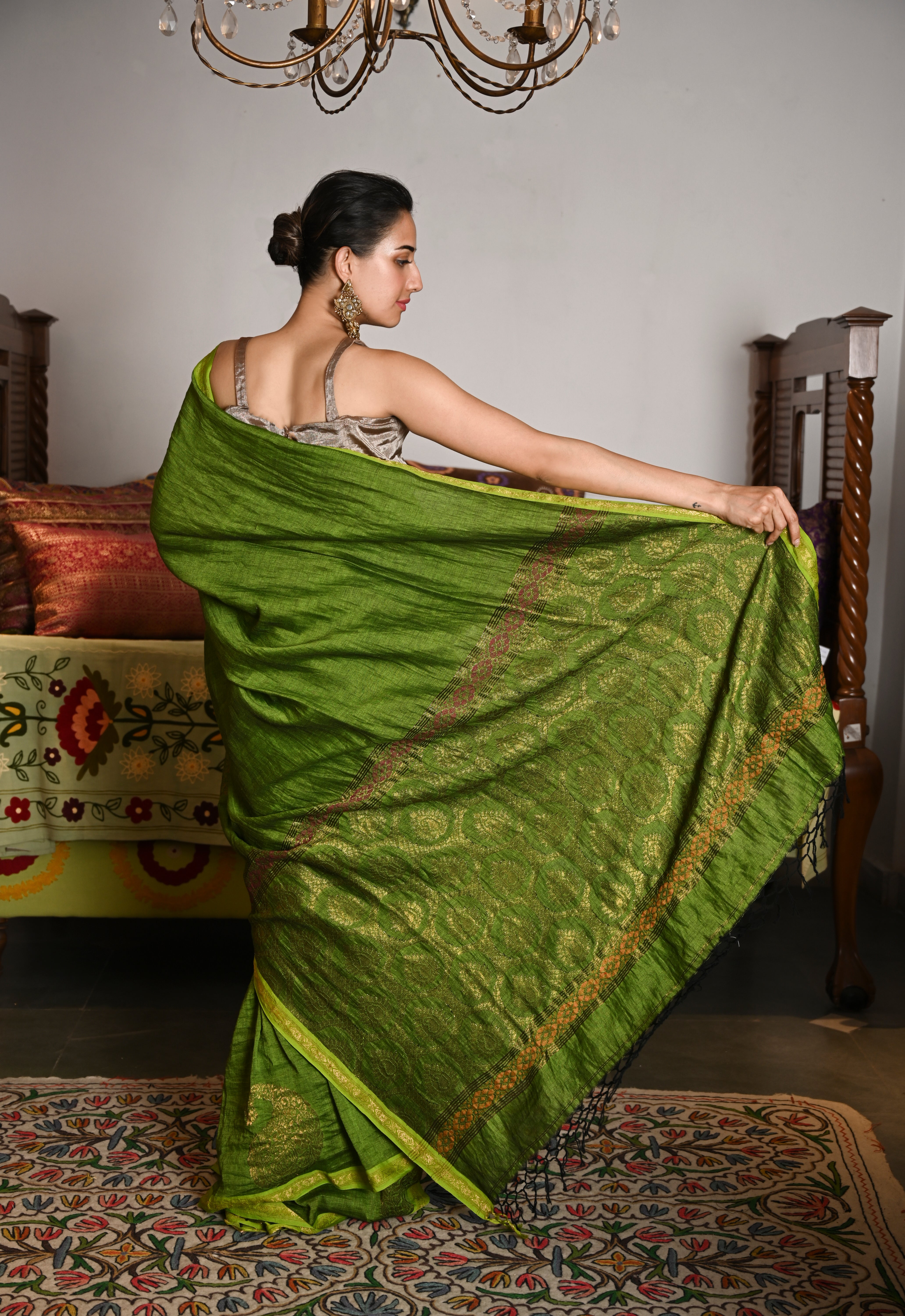 Keywords: green Jamdani saree, silk linen Zari saree, festive wear for women, luxury handloom saree.