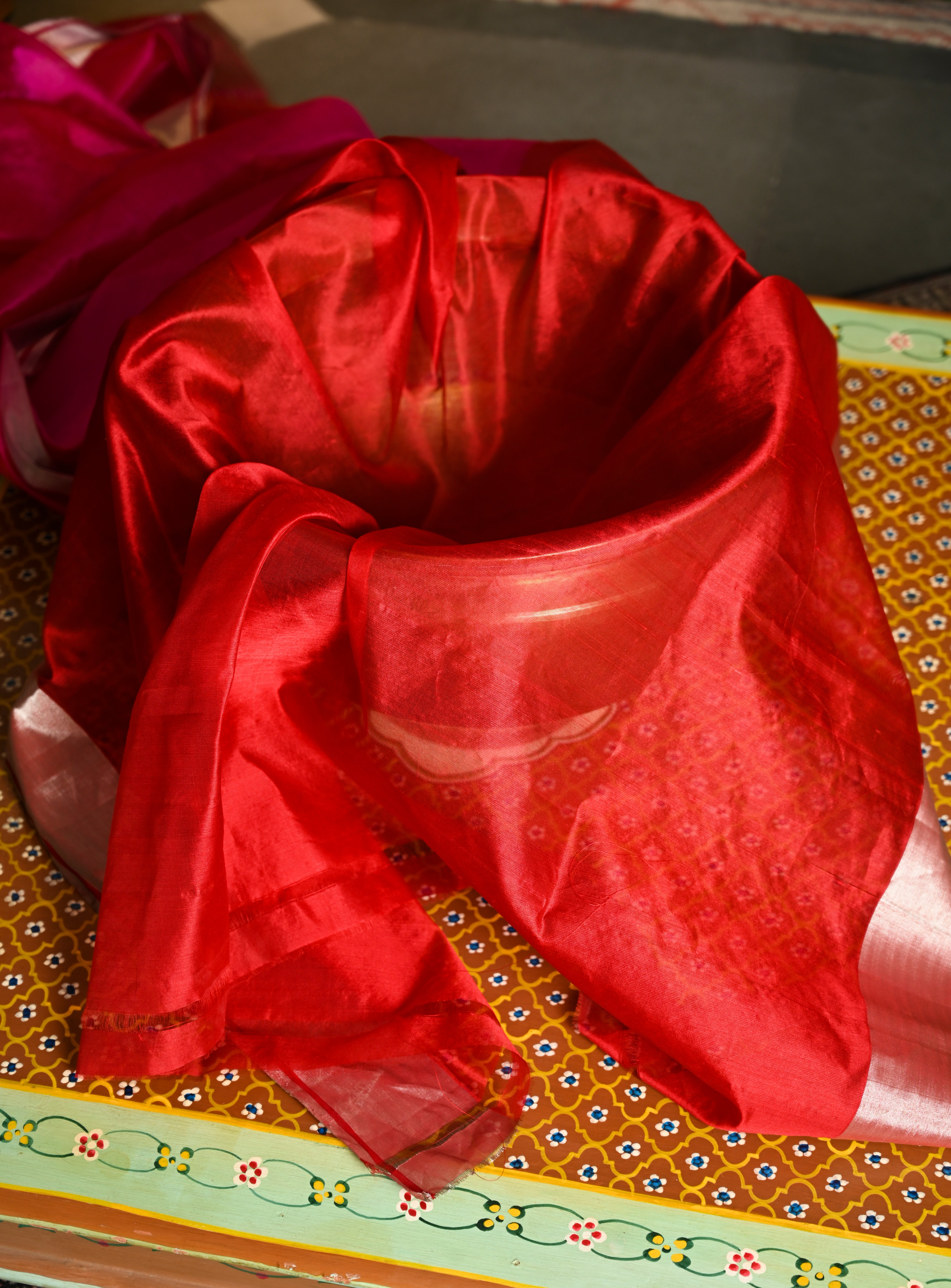 The vibrant hot pink base paired with a contrasting red blouse makes it a rare combination of tradition and modern elegance.