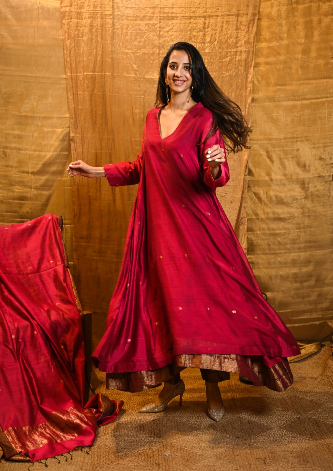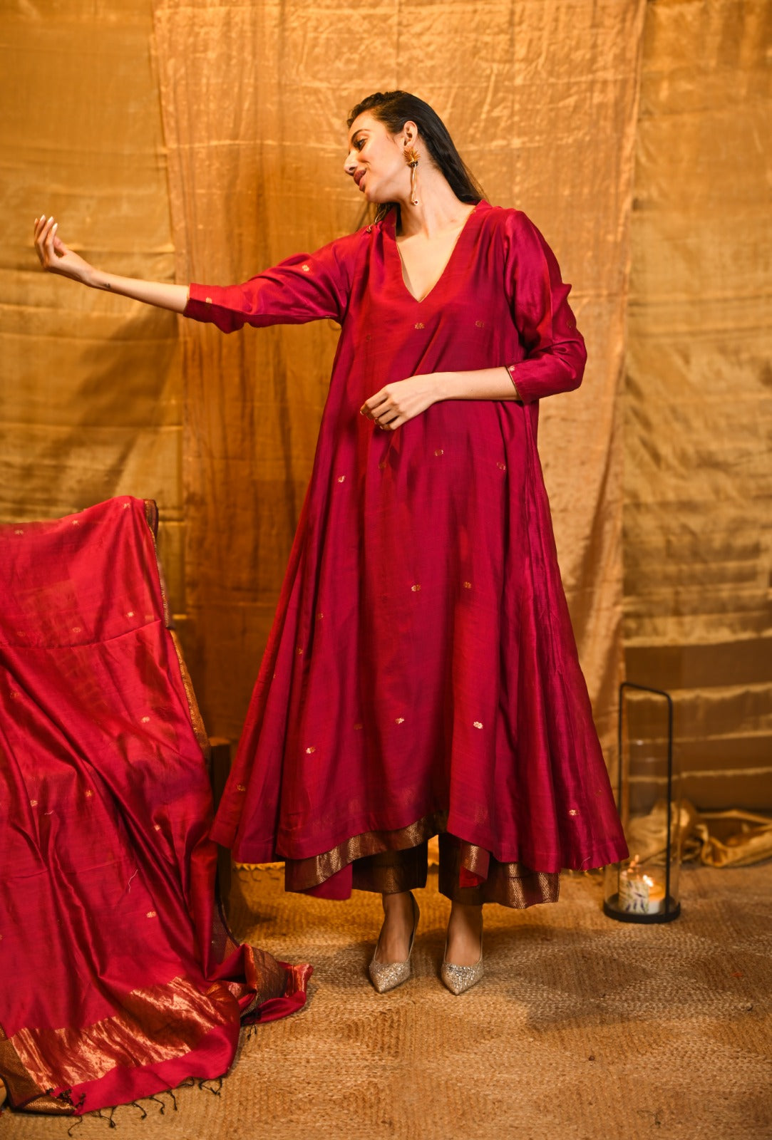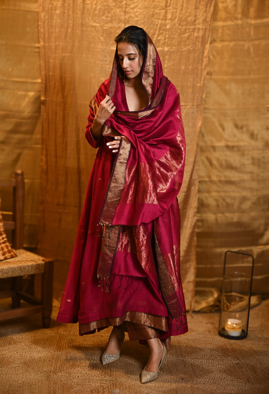 A timeless ensemble crafted in pure handloom Silk Maheshwari, this kalidar comes in a striking yet elegant fuchsia hue. The kurta and dupatta are adorned with handwoven Zari motifs, adding just the right touch of celebration without the weight.
