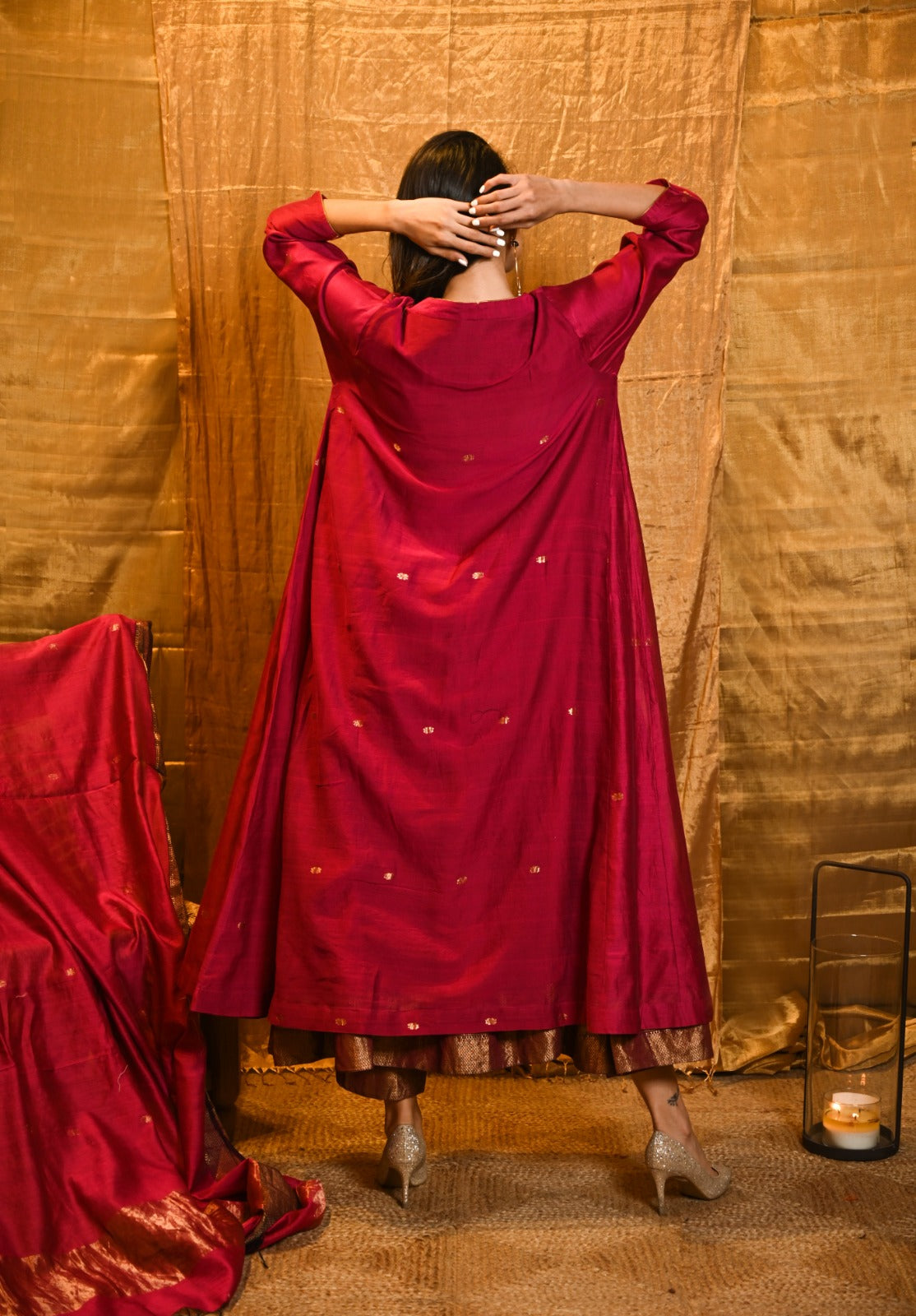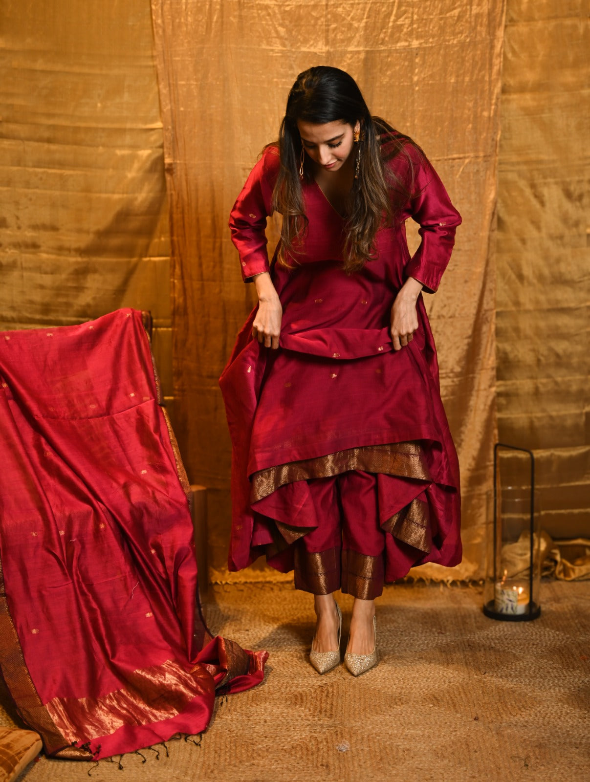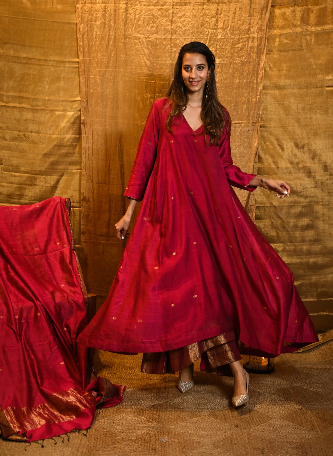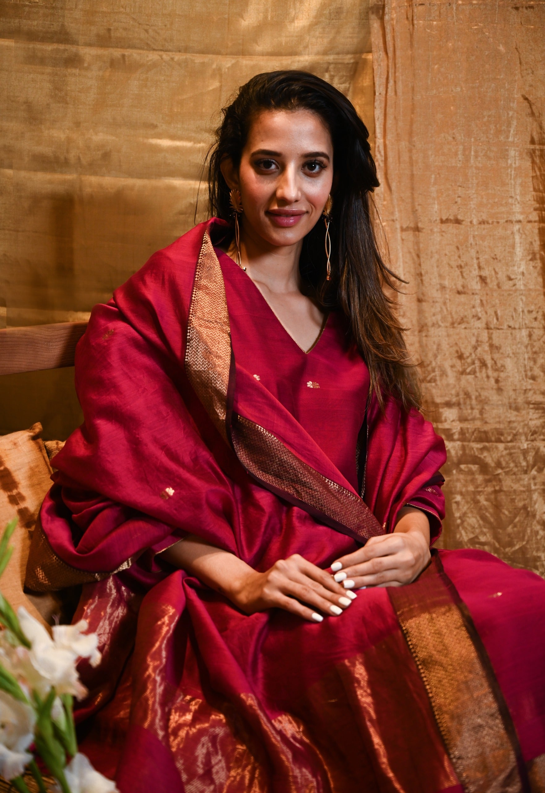 A timeless ensemble crafted in pure handloom Silk Maheshwari, this kalidar comes in a striking yet elegant fuchsia hue. The kurta and dupatta are adorned with handwoven Zari motifs, adding just the right touch of celebration without the weight.