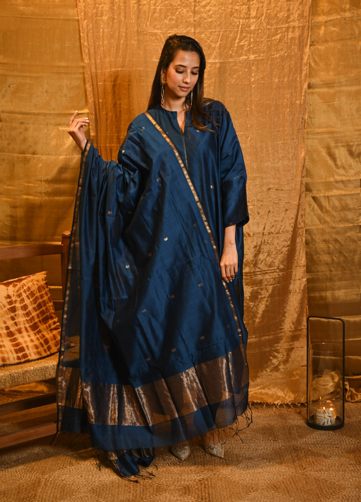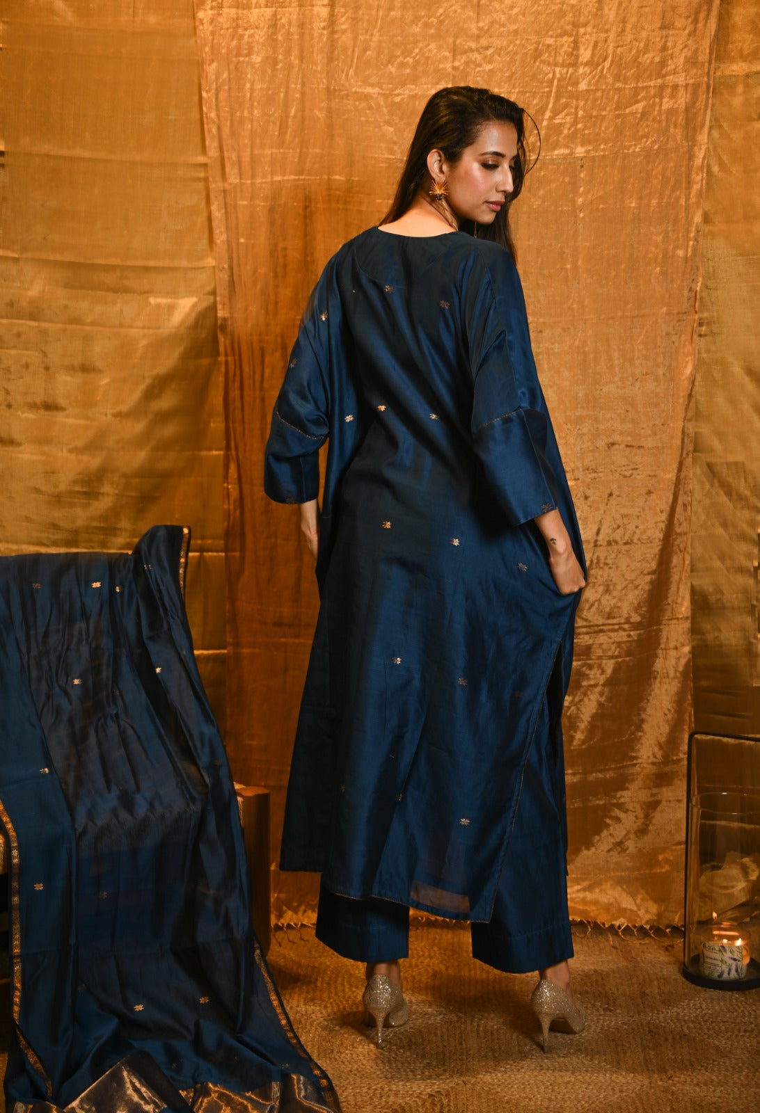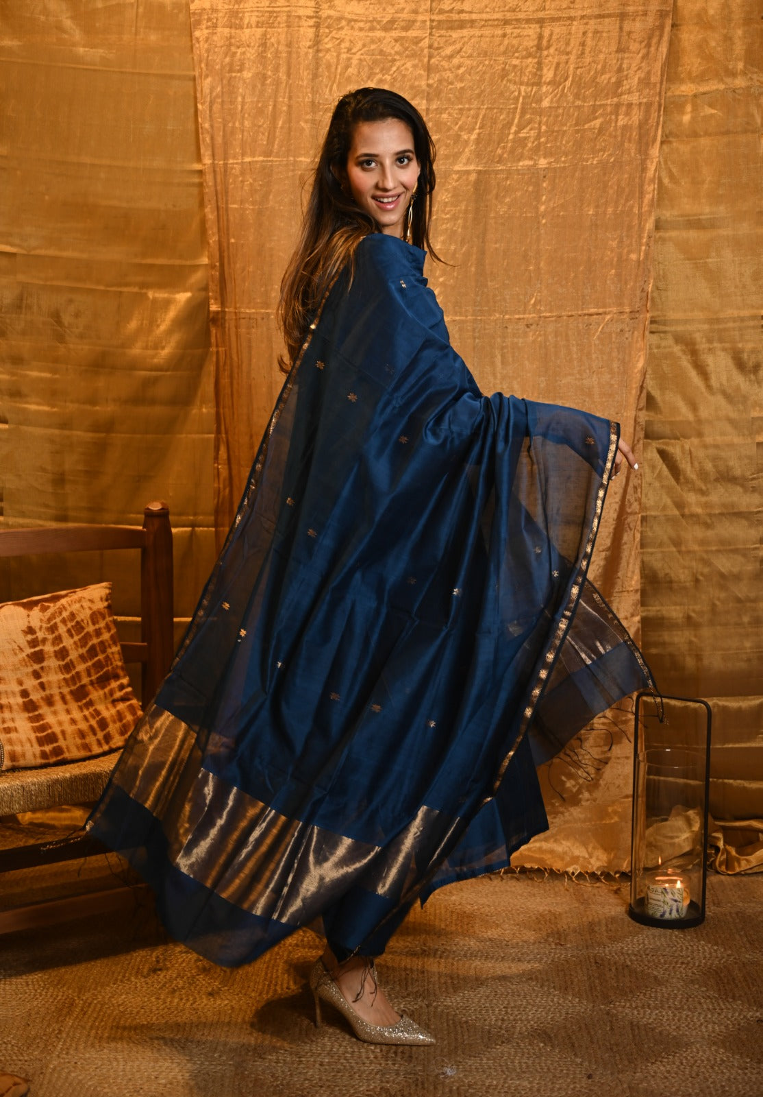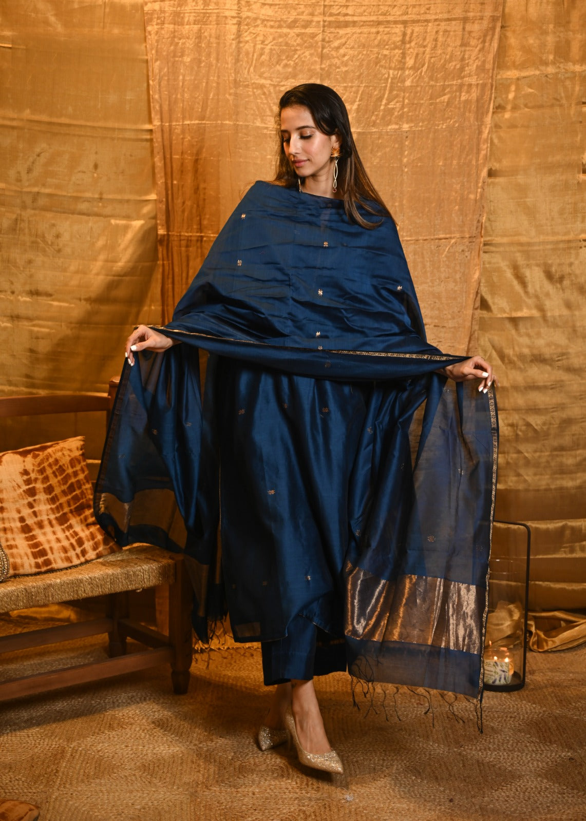 A rare and striking shade of blue that is hard to find — refined, rich, and instantly elegant. Crafted in pure Silk Maheshwari, this ensemble features beautiful handwoven motifs that add quiet luxury without being loud.