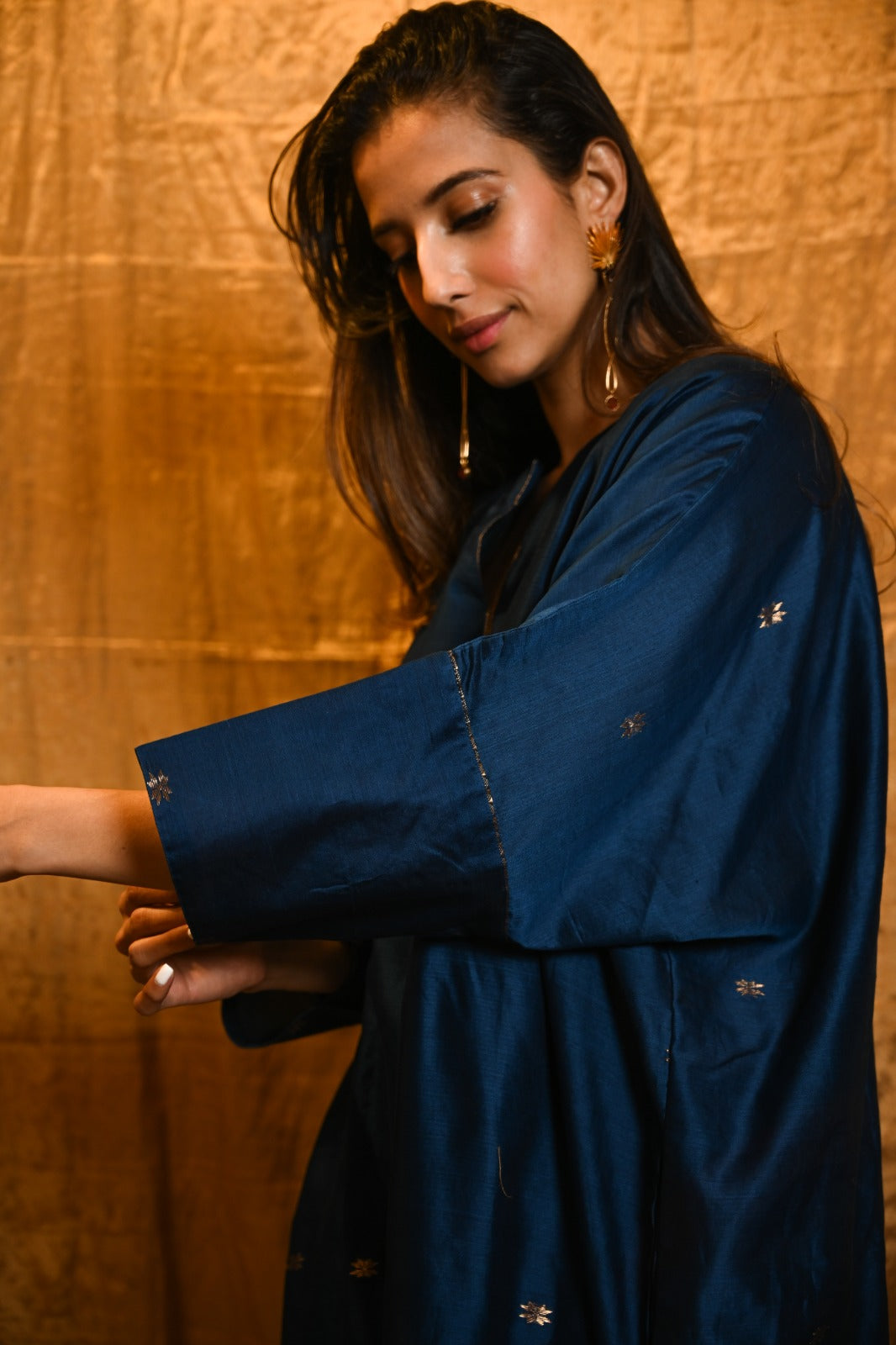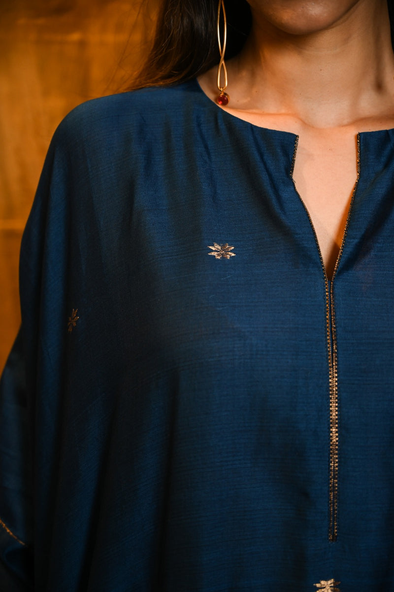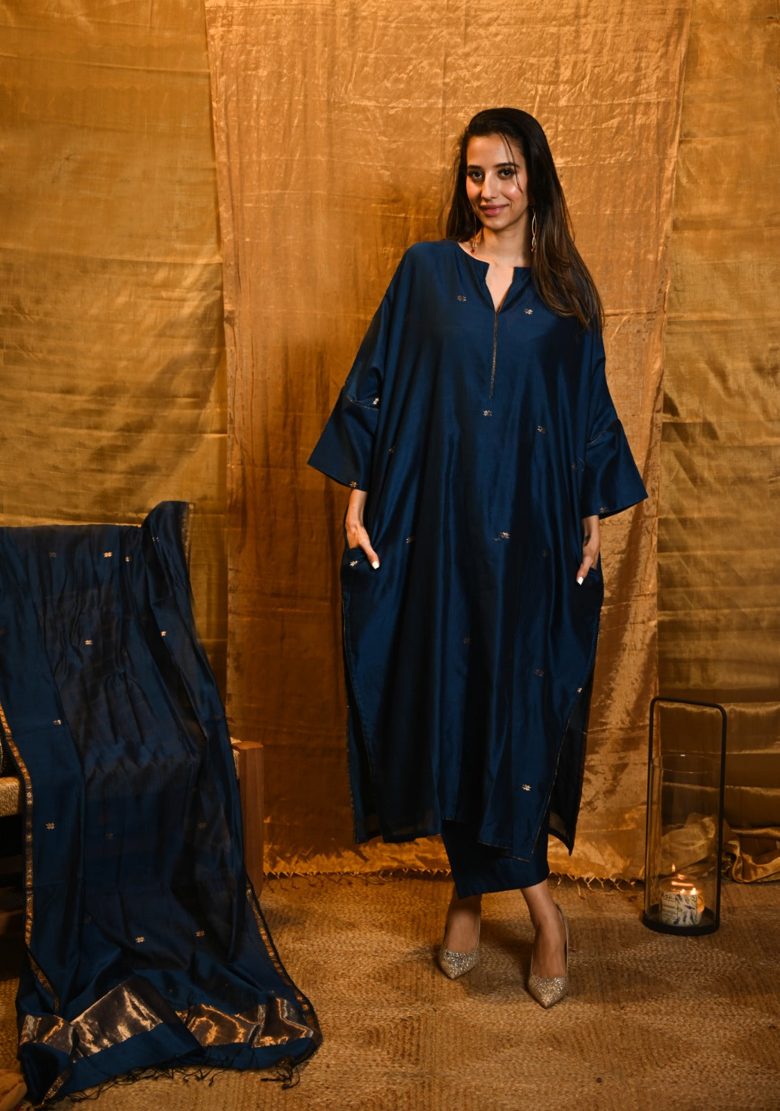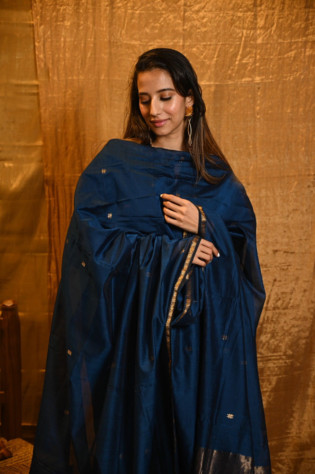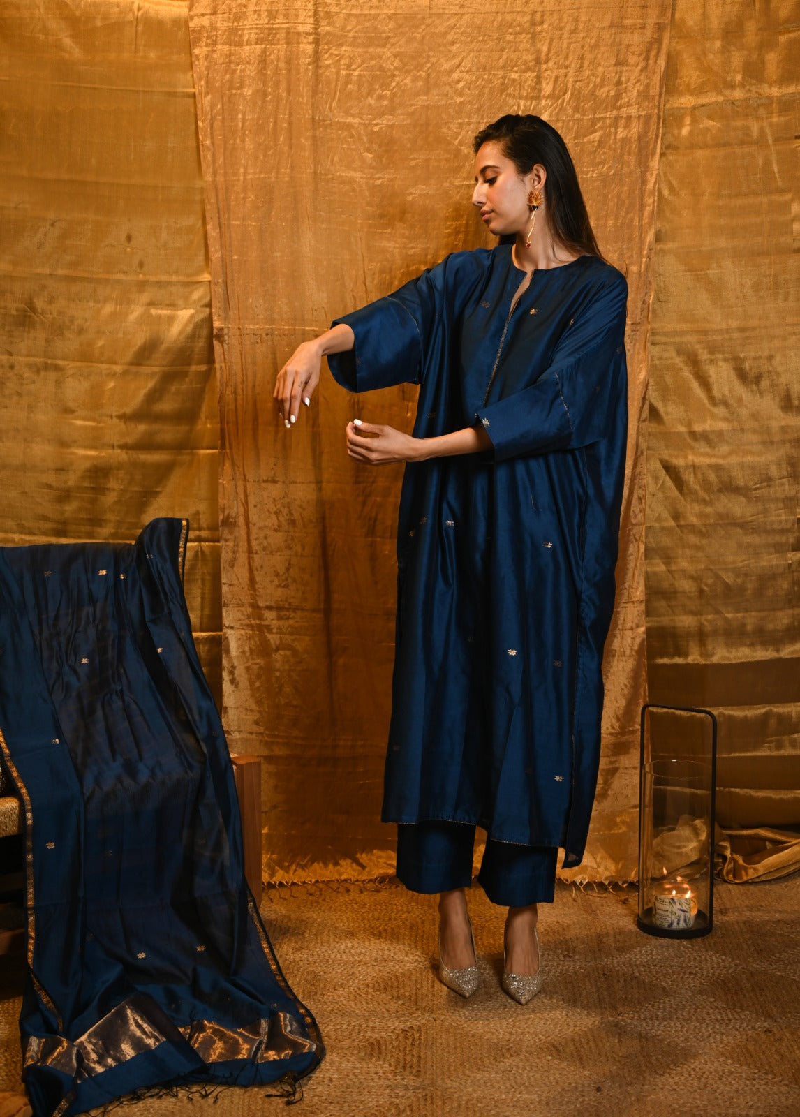 A rare and striking shade of blue that is hard to find — refined, rich, and instantly elegant. Crafted in pure Silk Maheshwari, this ensemble features beautiful handwoven motifs that add quiet luxury without being loud.