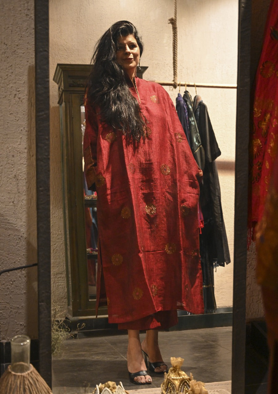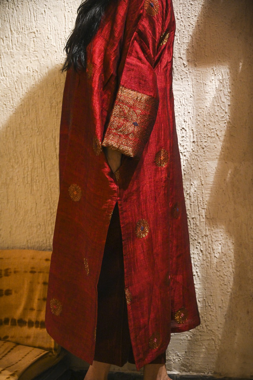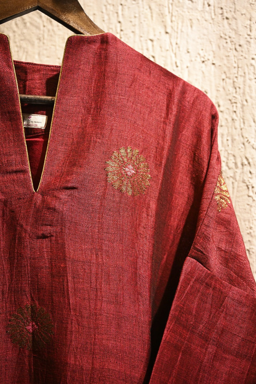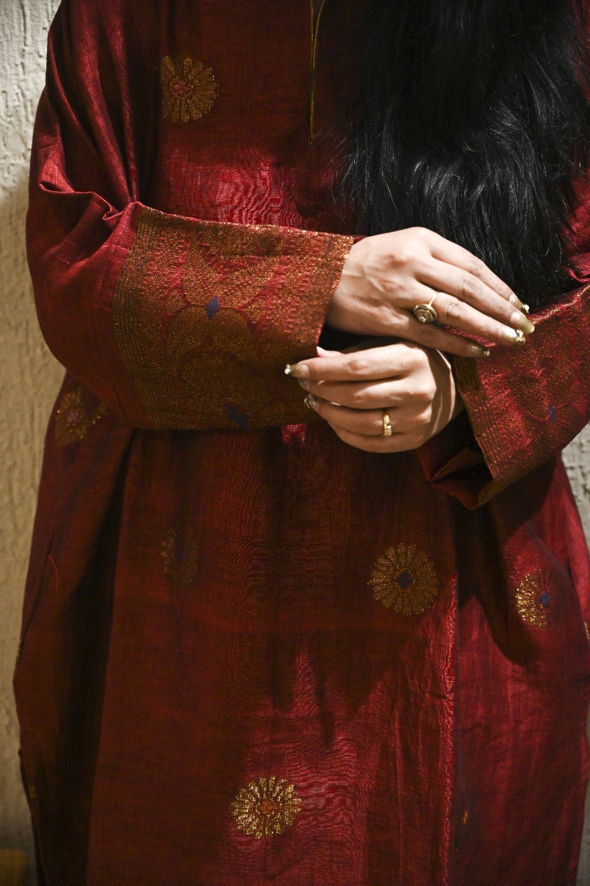 Finished in deep, regal hues with a natural silk sheen, these chogas offer a refined presence - ever loud, always powerful. The free-size silhouette allows ease of movement, a flattering fall, and all-day comfort, making it ideal for festive evenings, celebrations, winter weddings, and elegant occasion wear.